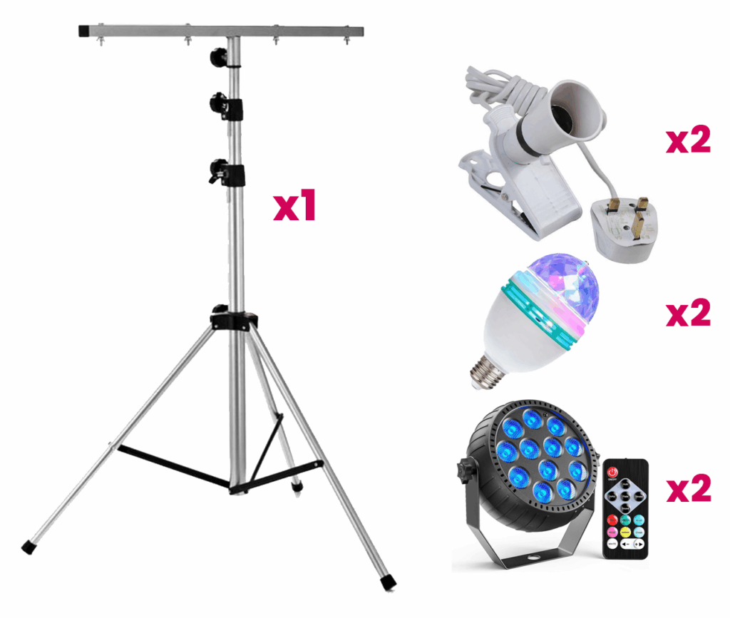 - Single T-bar light stand with clip-on plastic sockets and cheap Amazon disco bulbs